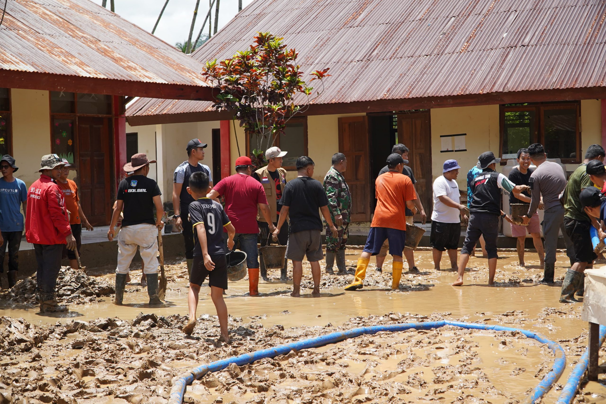 Terpantau juga, jajaran perangkat daerah dan personil TNI/Polri bergabung dengan warga setempat bahu membahu bekerja sama membersikan lumpur sisa banjir baik itu di desa Torosik, Adow, Tobayagan induk, Tobayagan Selatan, Dumagin B dan Dumagin A.