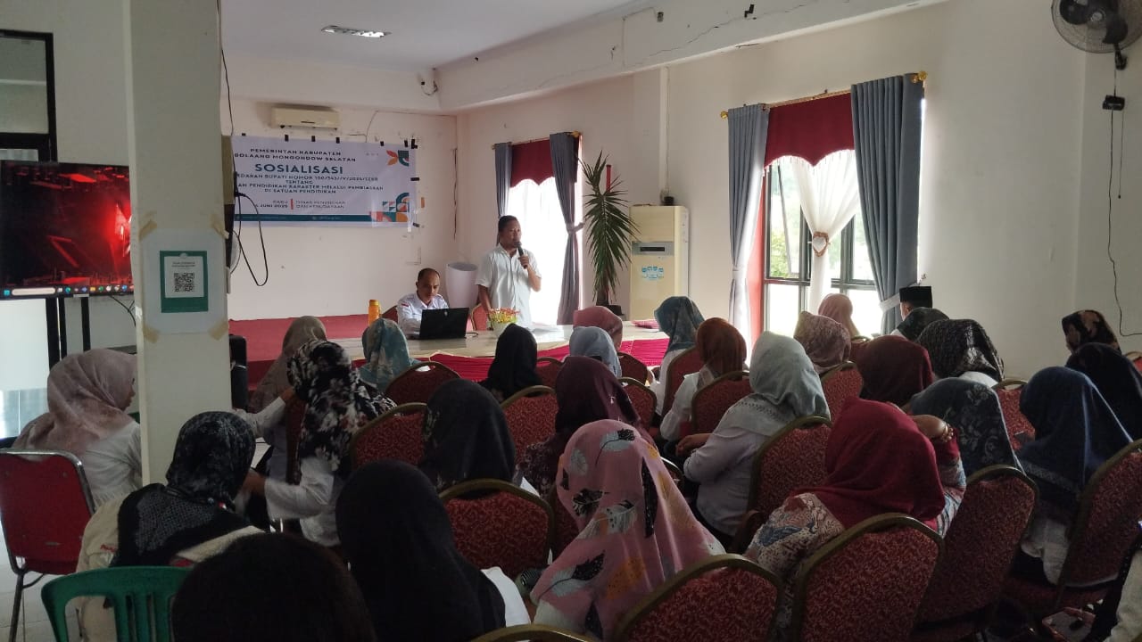 BOLSEL, Update24 – Dinas Pendidikan dan Kebudayaan (Dikbud) Bolaang Mongondow Selatan (Bolsel), menggelar sosialisasi terkait Surat Edaran (SE) Bupati Nomor 100/343/V/2025/Sekr, tentang penguatan pendidikan karekater melalui pembiasaan satuan pendidikan.